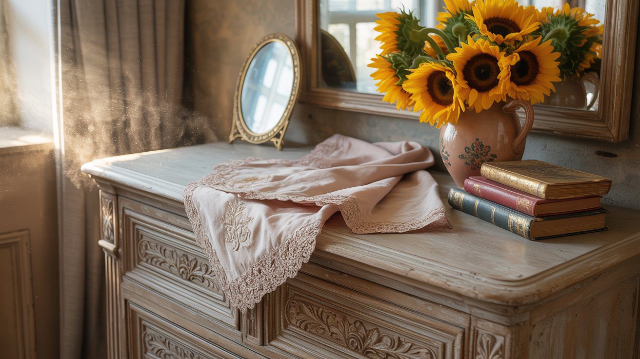Charming Vintage Dresser Decor Ideas with Sunflowers, Pink Lace, Books & Morning Sunlight – Cozy Bedroom Inspiration.