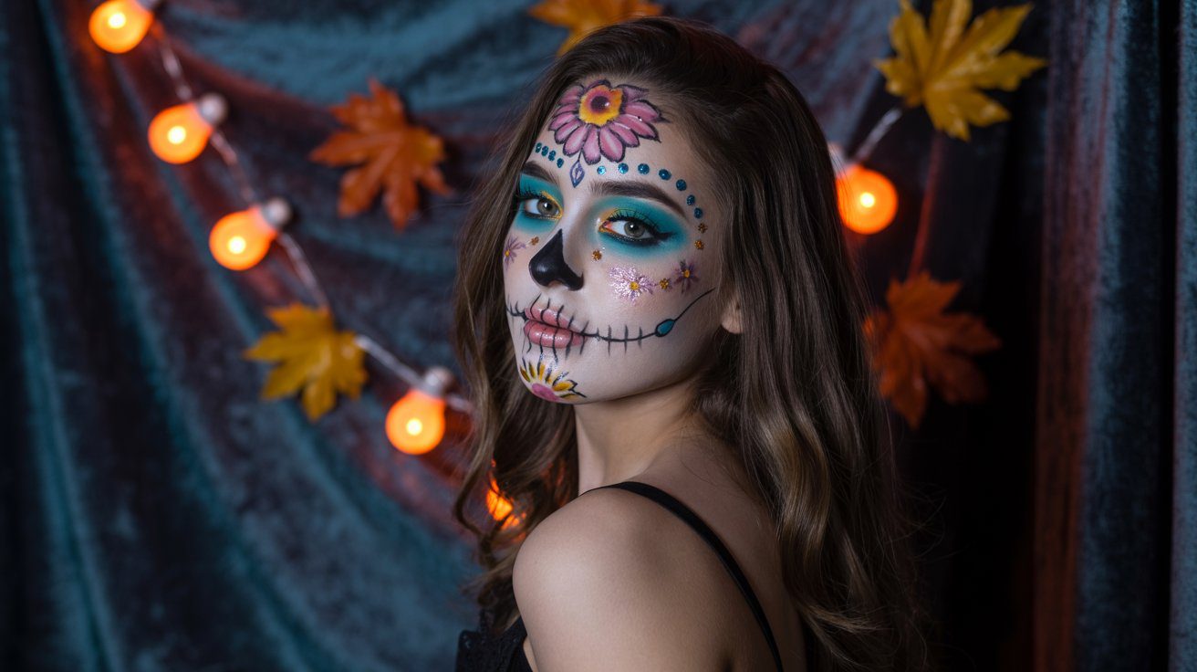 The Sugar Skull look is one of the most detailed and striking Halloween makeups you can do, inspired by Día de los Muertos traditions. It’s all about symmetry, bold color, and artistic detail.