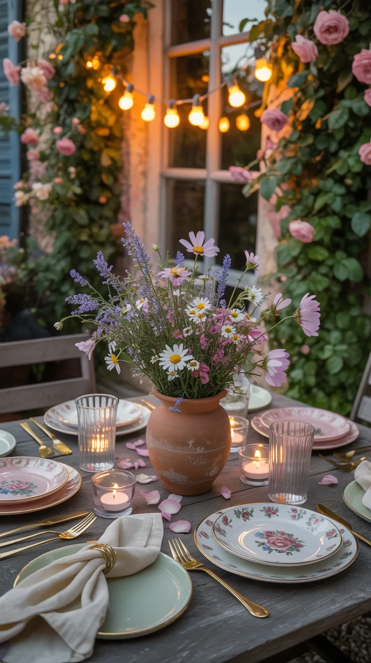 Mix different types of lighting for maximum impact: string lights provide the magical overhead ambient glow, outdoor lanterns add cozy table-level interest, and citronella candles serve double duty—keeping bugs at bay while adding to the romantic ambiance.