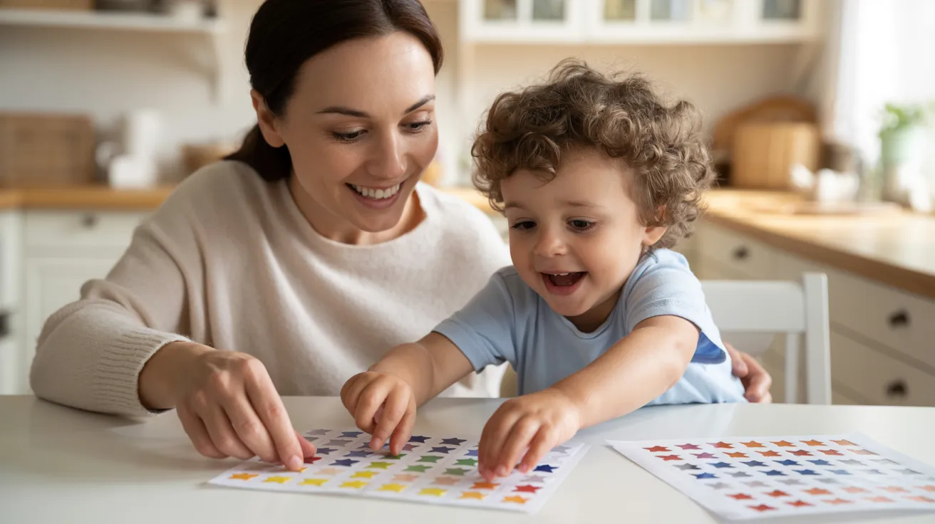 Mom and toddler son sitting together at kitchen table setting up a colorful reward chart with star stickers